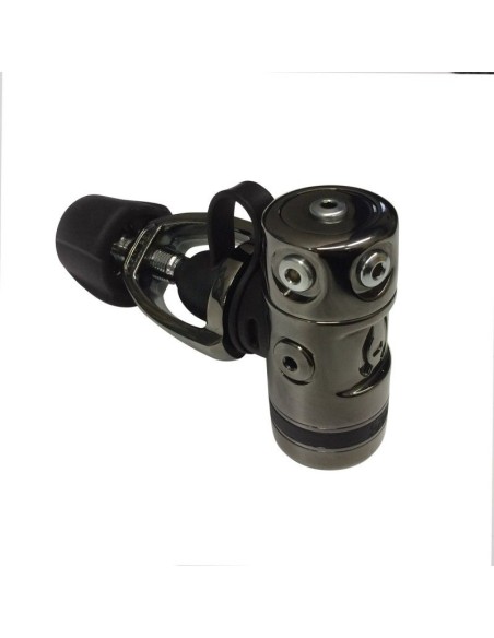 The DCX high-performance, over-balanced first stage, provides progressively greater intermediate pressure as depth and gas density increases for superior gas delivery under the most extreme conditions. Based on the DC1 the DCX also has a 5th low pressure port that points directly down from the first stage providing easy hose routing for backmounted doubles, sidemount or even for recreational divers. It differs from the DC1 in that it is lighter and protected by a super hard PVD* (Physical Vapor Deposition) coating. PVD is by far the most durable coating available and will out last any traditional finish.