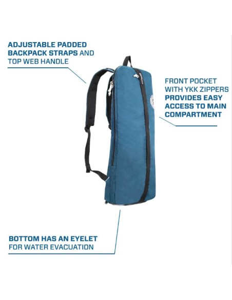 Enjoy hassle-free snorkeling and beach activities with the new Sport Bag 10. This backpack is designed long and narrow to accommodate fins, mask and snorkel as well as other must-have beach items. A handy zippered back pocket is great for smaller belongings. Front pocket provides easy access to the main compartment.