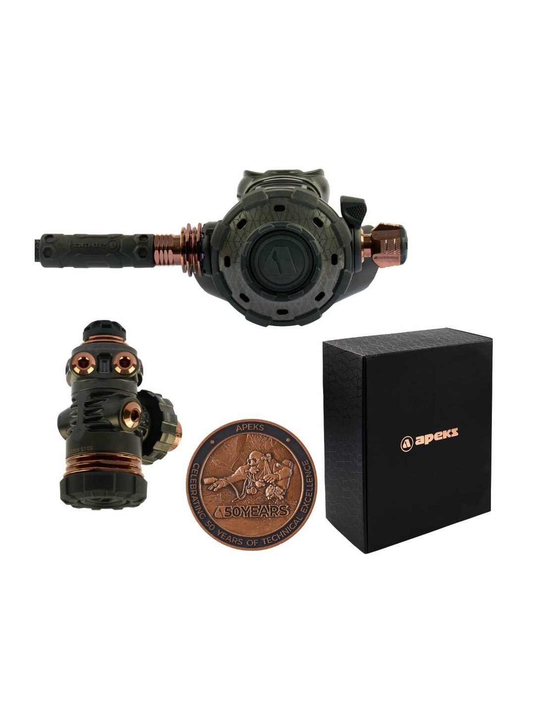 Apeks celebrates its 50 years, and to commemorate it it has launched a special limited edition of the MTX-RC regulator, with a luxurious PVD coating. Each regulator comes with a commemorative coin matching the regulator's serial number, and an exclusive unboxing experience to match the occasion. Celebrate with us and become "one of the privileged few" to own a piece of Apeks history