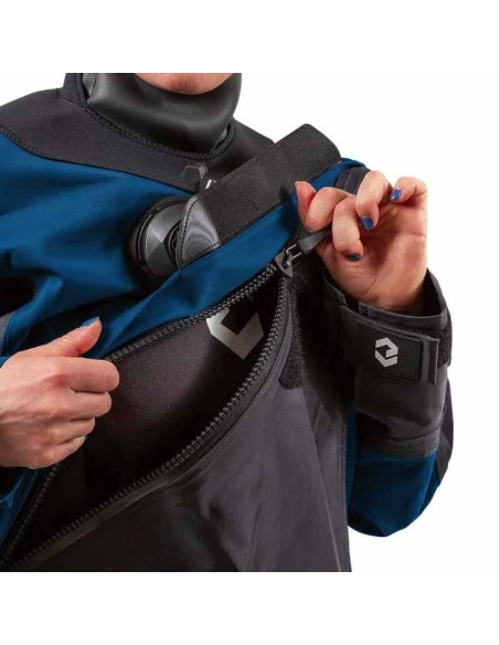 The pattern allows complete freedom of movement, making the dive safe and comfortable, and prevents excess air from moving inside the suit. The drysuit seal uses a TiZip zipper, protected by a flap from the shoulder to the hip. Our inflation and exhaust valves are high performance. The inflation valve allows an upgrade to connect a canister for electrically heated underwear. The exhaust valve can be adjusted according to the profile of the dive. The wrist seals are HD bottlenecks and are made of high-strength latex.