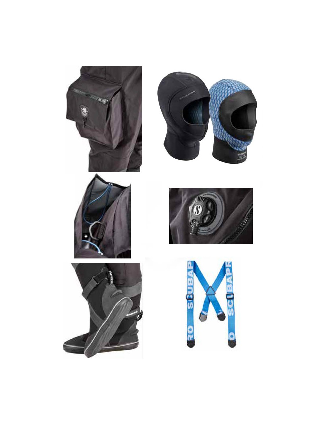 - Suspender system enhances fit and provides convenient lower suit support between dives