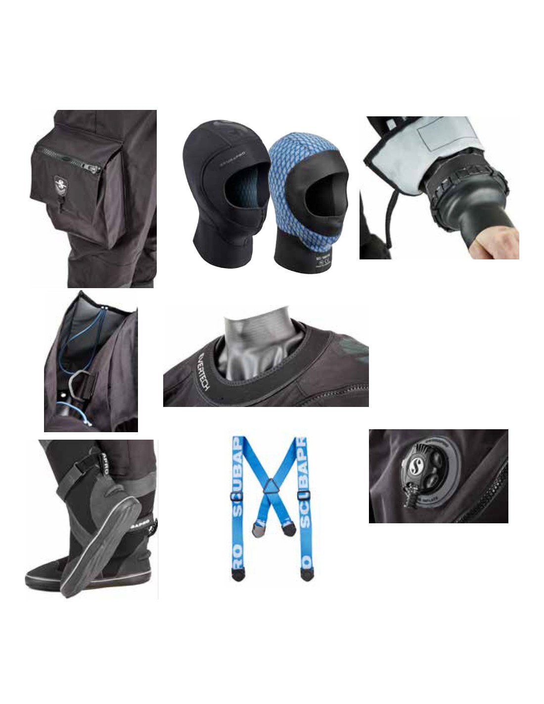 - Blue suspender system enhances fit and provides convenient lower suit support between dives.