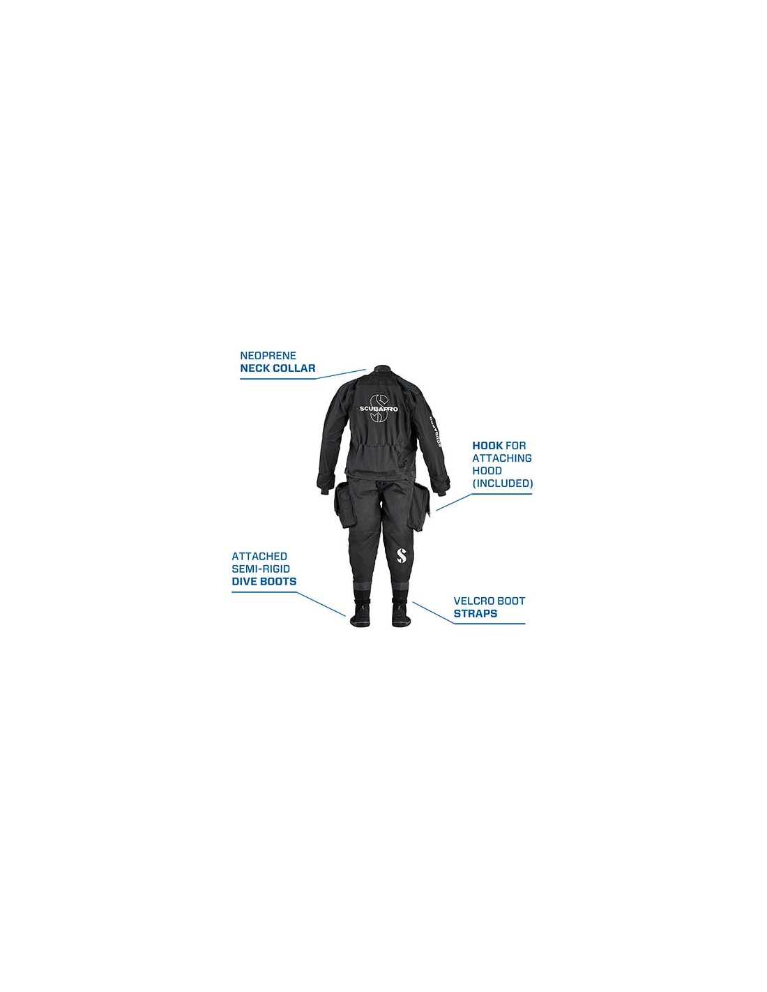 Evertech Dry Breathable is a premium trilaminate drysuit designed for avid divers. This dry suit is top quality throughout from breathable fabric nylon/PU/nylon trilaminate blend, stiched and waterproofed taped seams to a diagonal front waterproof zipper and a Si-Tech ring seal system and valves. A neoprene neck collar keeps the hood in place, the Si-Tech valves are mounted on stitched and glued pads to help ensure trouble-free airflow control, and the attached semi-rigid dive boots feature soft yet protective soles. Large cargo pockets and blue suspenders are among the features included on a suit designed to keep you warm, dry and comfortable in all water conditions. The Evertech Dry Breathable is also super lightweight: A medium size suit weighs only 3.340kg (without hood, bag & hose).