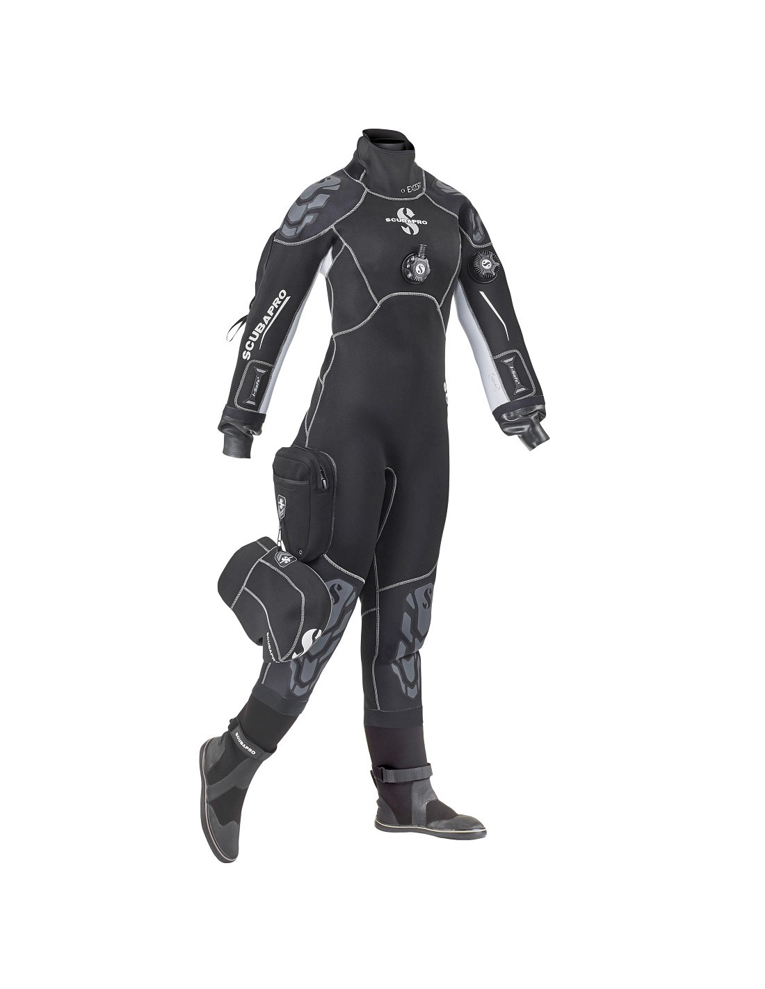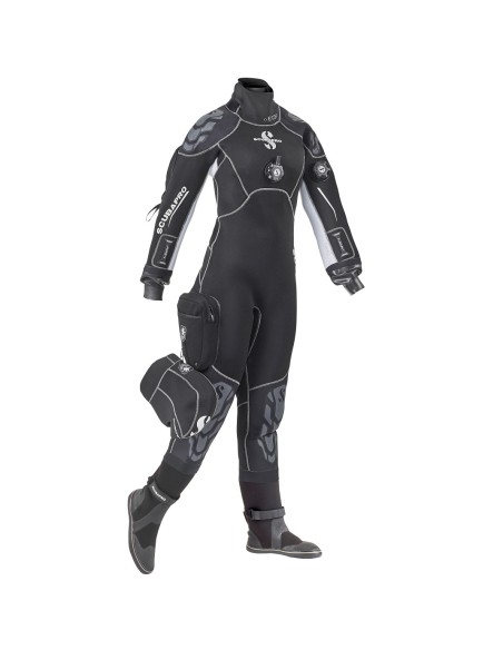 The premium-plus Exodry offers a unique approach to drysuit design by fusing 4mm high-density neoprene with latex wrist and neck seals. This hybrid design is extremely effective, delivering minimal inherent buoyancy, maximum range of motion and an excellent sealing system. This comfortable suit comes with protective shoulder and knee panels, a plush interior lining, blue-style suspenders and much more. The Exodry 4.0 comes with shoulder and knee panels, a plush interior lining, suspenders and a attached semi-rigid dive boot with fin strap retainer that includes a hook & loop strap that improves fit while preventing air from travelling to the boot when diving in the heads-down position. The Exodry is a smart choice for all types of diving and can be used with or without an undersuit.