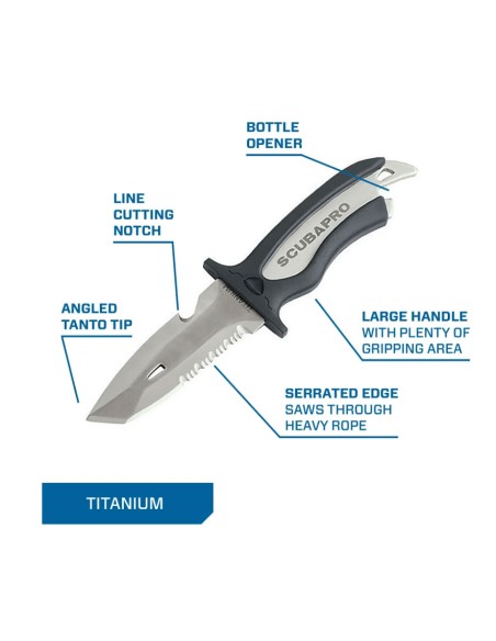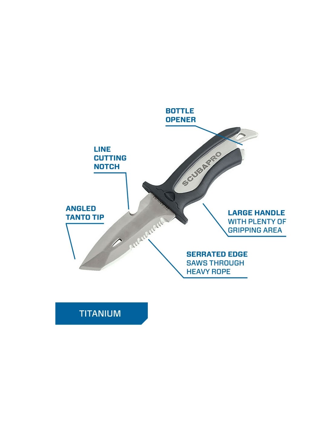 The MAKO TITANIUM knife is so light and compact you won't even know it's there, yet its titanium blade is incredibly strong, resists rust, and has the hardness to take and hold a sharp edge. The MAKO TITANIUM offers a multi-function blade that includes a serrated edge for sawing through rope, a conventional edge for making clean slicing cuts, a line-cutting notch, and a bottle opener. The Tanto tip, with its angled shape, is one of the strongest knife points available. The knife’s handle offers plenty of gripping area as well as thumb guards to keep the knife from slipping. Included is a locking sheath. This is an excellent corrosion-resistant, maintenance-free, general-purpose dive knife.