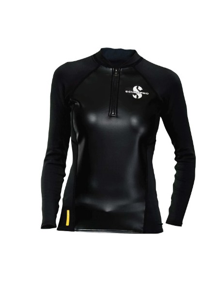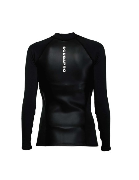 SCUBAPRO's HYBRID THERMAL LONG SLEEVE TOP features smooth-skin 1mm neoprene in the torso area and high-stretch nylon material on the sides, sleeves and collar. On the underside of the nylon panels a microplush interior makes the top warm and cozy. This fleece fabric absorbs less water, which keeps heat against the body, increasing overall warmth. It also dries quickly.This stylish warmer can be worn by itself or as a thermal under-layer beneath a traditional wetsuit. It can also act as a barrier to the sun's rays when snorkeling or swimming.