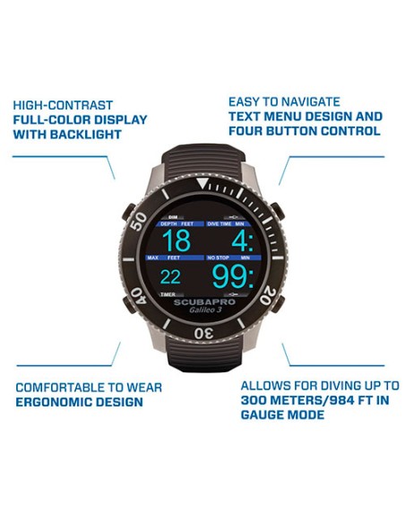 With a vibrant color display for easy readability, the SCUBAPRO Galileo 3 (G3) offers a modern watch-style dive computer in a classic timepiece look. Utilizing Galileo’s trusted menu design and four button control, it’s extremely intuitive to navigate through dive modes, two algorithm choices, screen styles and other personalized dive management options. Powered by a rechargeable lithium battery and built to last with a stainless steel housing, the G3 delivers everything you need in a dive computer with the comfort and style of an everyday wristwatch