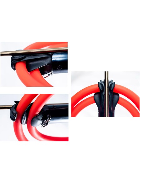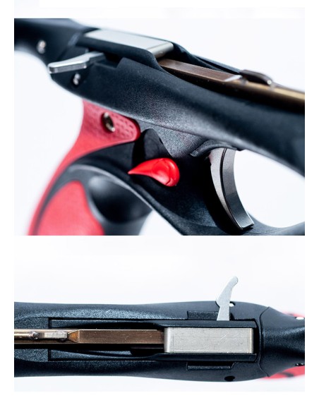 Anticorodal black frame with integrated spear guide, grip made of engineering plastic reinforced with glass fibre, high or low soft sternal support. Composite material release mechanism with trigger, release tooth and lateral guide line release obtained from the base. The shock absorber makes silent the release of the shaft. Reversible side safety mechanism. Reinforced reel with steel pin buckle. Head for double elastic with magnetic spear lock: as soon as the spear is put in place, it is held by two magnets mounted in a watertight chamber. This characteristic guarantees maximum speed of reset without the disadvantages of conventional mechanical restraint systems
