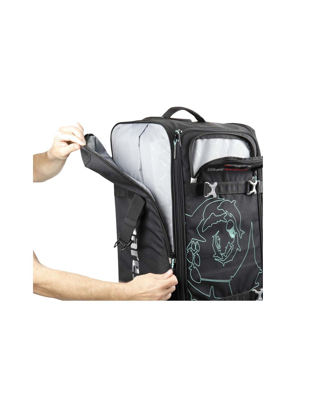 Optimize your dive travel with the Cruise Backpack, now eco-friendly in 100% r-PET. This 100-liter bag boasts a telescopic handle, large sturdy wheels and adjustable compression straps for compact storage. The interior features tie-down straps, an inspection zipper and ultralight buckles. Enjoy comfort with padded shoulder straps and the air mesh handle. The bag includes an external fin pocket with drainage, side handles and A.T.O. for hassle-free air travel.