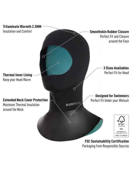The Buddyswim neoprene swim hood is designed to keep your head and neck warm during open water swim sessions. Made with 2.5mm Trilaminate Warmth, a three-layer neoprene composition developed by Buddyswim to offer optimal protection and flexibility. Designed to go under the wetsuit and provide great thermal insulation for the head, face and neck. It can also be worn under a wetsuit cap for maximum thermal protection in colder waters.