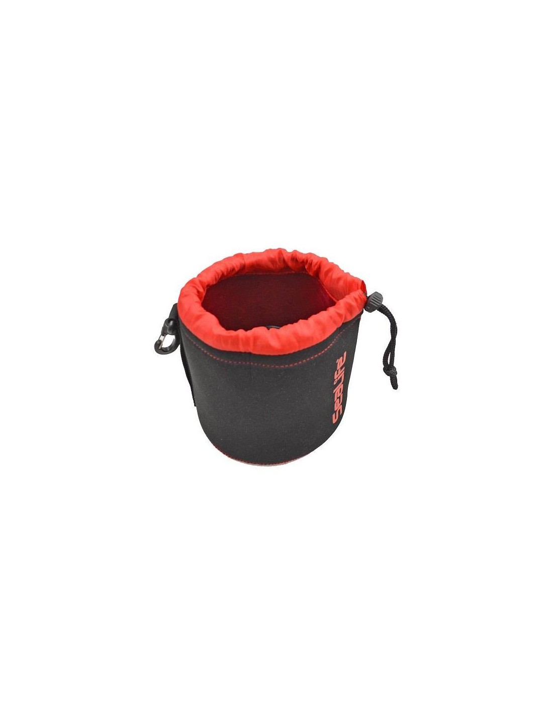 The SeaLife Protective Pouch. This soft-lined pouch protects cameras, lenses, lights, and other precision diving equipment. The interior is lined with soft velvet "Gear Pouch" material that prevents scratches on sensitive optics and electronics, and is specially designed for lenses. The exterior features coated neoprene, a swivel clip, and belt loops. The collar has a water-resistant lining and a webbing drawstring with a sliding closure to seal the top of the pouch. Interior dimensions: 13 cm diameter, 15 cm height; 1 liter volume. The pouch is designed to fit inside the SeaLife Foto Pro Backpack.