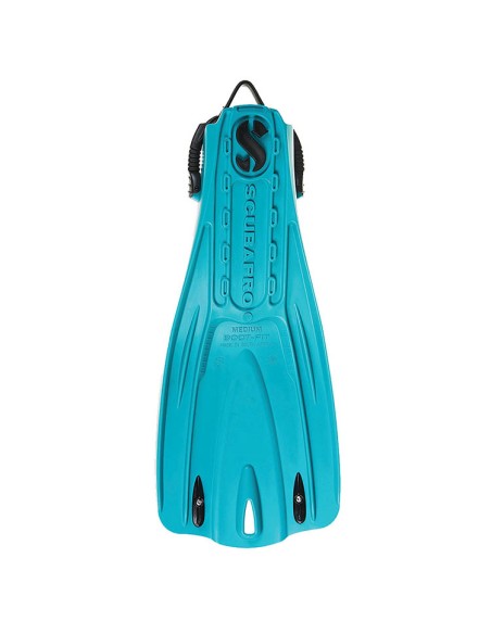 - El diseño abierto del talón -«Boot-Fit»- incorpora una correa elástica autoajustable y fácil de sustituir que permite un acople más versátil y facilita la colocación y retirada de la aleta.