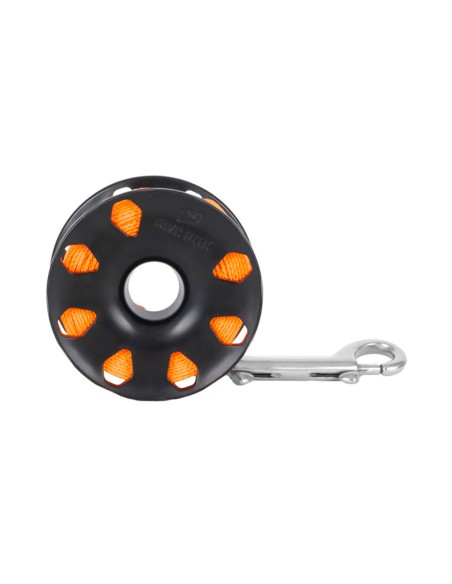 Spool de generosas dimensiones con hilo Naranja y mosquetón doble de acero inox