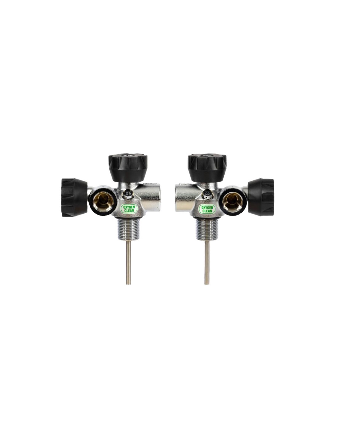 Conjunto de griferías Lola derecha e izquierda para botellas con rosca de cuello 3/4'' NPSM 200Bar / 2900psi destinada principalmente para bibotellas, rebreathers SCR y rebreathers en configuración DIR. Las válvulas están limpias y en servicio de oxígeno (nitrox). El puerto del disco de ruptura está provisto de un tapón rosca 3/8".