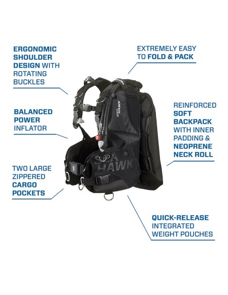 Este popular chaleco hidrostático multiuso incluye un nuevo diseño ergonómico en los hombros, con hebillas giratorias, y un nuevo y suave backpack reforzado. Estas mejoras aportan al Seahawk 2 una mayor ligereza que su antecesor y facilitan al máximo el plegado y el almacenaje. La cincha Super Cinch de acero inoxidable para la botella se ha situado un poco más abajo que antes y se ha añadido una correa de Velcro adicional para asegurar la botella durante la inmersión. Otras novedades destacables son la correa de cintura de 50 mm con hebilla ligera, los bolsillos de almacenamiento rediseñados y la nueva gama de accesorios para latiguillos y válvulas. Con un contorno hidrodinámico y una excelente flotabilidad cuando es necesario, el nuevo Seahawk 2 es la opción perfecta para buceadores que buscan libertad de movimiento, comodidad y estabilidad mientras exploran las profundidades.
