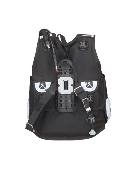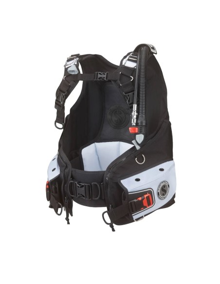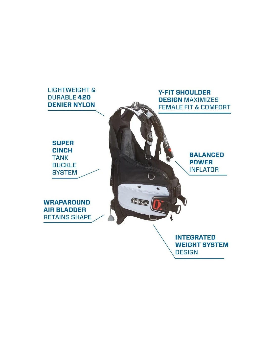 El chaleco Bella está diseñado exclusivamente para buceadoras, con un entallado preciso y de ajuste frontal para mayor seguridad y presenta bolsillos de almacenaje grandes, un sistema de lastre integrado, acolchado de la espaldera mejorada y un llamativo esquema de colores en blanco. Este chaleco de altas prestaciones incluye la exclusiva vejiga de aire envolvente del Bella, que rodea el cuerpo incluso cuando el chaleco se encuentra totalmente hinchado, para disfrutar de un ajuste confortable y estabilidad bajo el agua y en la superficie. Los hombros de este chaleco también cuentan con un diseño de cinchas en Y que se adapta mejor al cuerpo femenino, para permitir un excelente control y una mayor amplitud de movimiento de brazos. Una anilla triangular de acero inoxidable gestiona las fuerzas en el centro de la Y, para equilibrar la presión en el cuerpo y mantener el arnés bajo control, independientemente de su posición en el agua. Esto garantiza una exploración cómoda y segura por las profundidades.