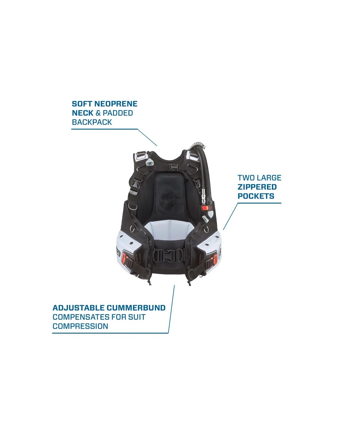 - El cinturón ventral ajustable compensa la compresión del traje, garantizando un óptimo ajuste a cualquier profundidad.