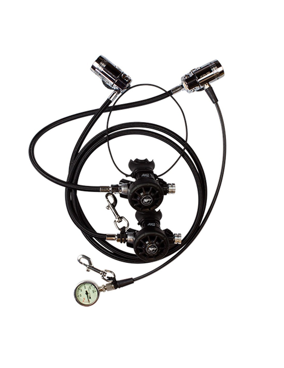 Montado con latiguillos ScubaFlex y manómetro ScubaForce. Cuenta además con los mosquetones correspondientes para la 1ª etapa principal y el manómetro y el collarín para la 2ª etapa secundaria