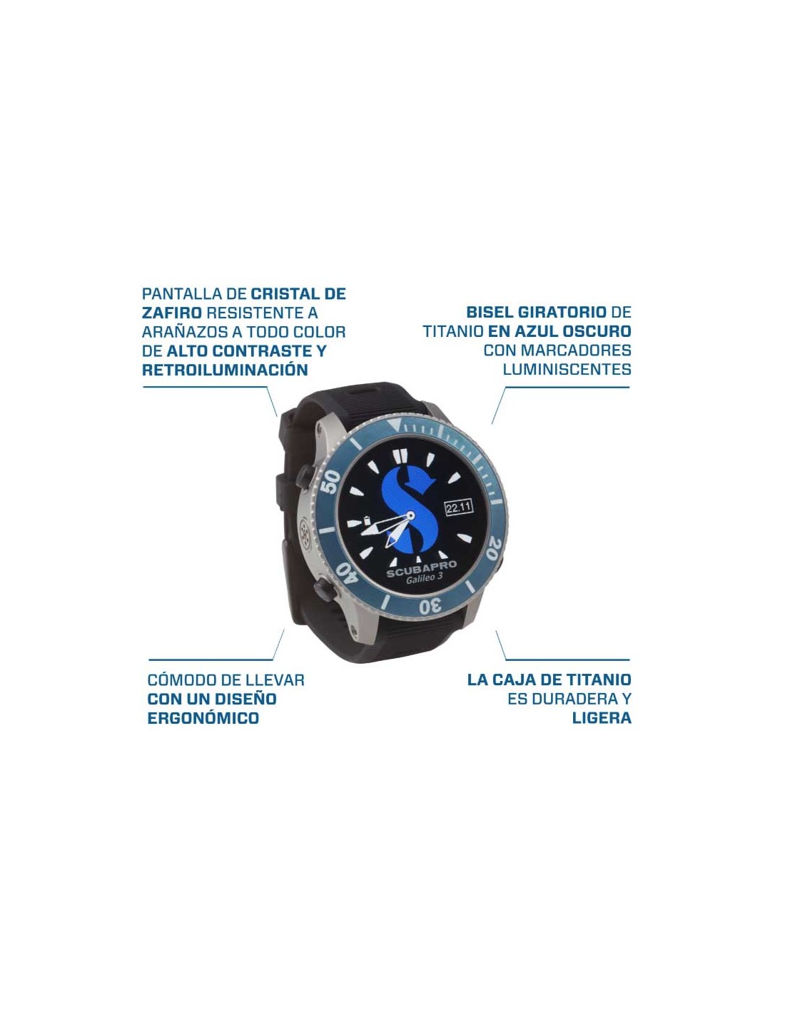 Galileo G3 (G3) es el ordenador de buceo tipo reloj de alta gama de SCUBAPRO, que combina un diseño elegante y una pantalla en color con el aspecto de un reloj clásico. La luminosa pantalla a todo color de alto contraste del G3 permite una fácil legibilidad y su retroiluminación una excelente legibilidad en todas las condiciones.. Además, cuenta con retroiluminación para garantizar una excelente visibilidad en todas las situaciones. Gracias al fiable diseño de menús y al control de cuatro botones de Galileo, resulta extremadamente intuitivo moverse por los seis modos de inmersión, las dos opciones de algoritmo, los estilos de pantalla y otras opciones personalizadas de gestión de inmersiones. El G3, está alimentado por una batería de litio recargable en una carcasa de acero inoxidable. Le ofrece todo lo que necesita de un ordenador de buceo combinado con la comodidad y estilo y la utilidad de un reloj de pulsera de uso diario.