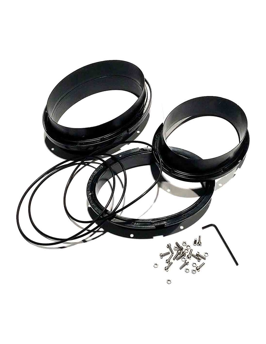 El sistema consta de dos aros que encajan uno dentro del otro y una contundente y simple junta tórica que hace que la estanqueidad del conjunto sea inalterable. las dos piezas quedan firmemente fijadas una con la otra mediante la tornillería de acero inoxidable suministrada.