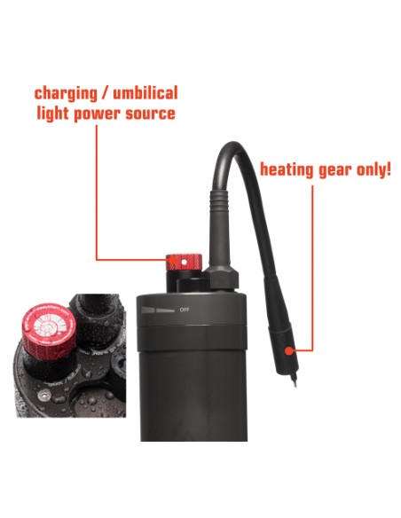 La batería Ammonite ACCU THERMO ha sido diseñada para suministrar energía de manera eficiente y segura a los sistemas calefactables de buceo y cualquier elemento como por ejemoplo cabezales de iluminación del tipo umbilical que funcionen a 12 V.