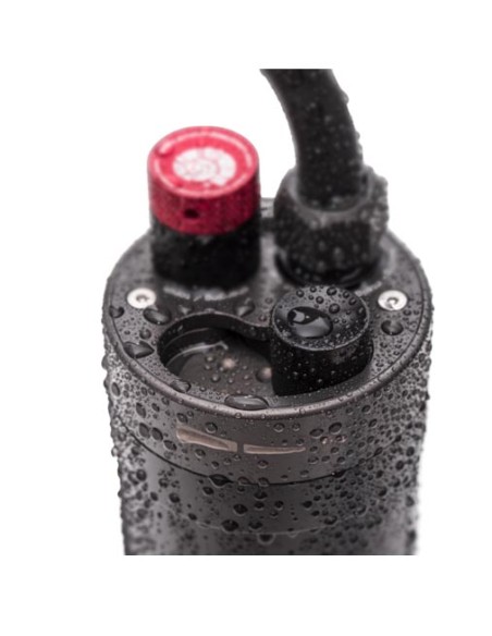 Puerto de alimentación para sistemas de iluminación: El puerto de "carga/linterna" se utiliza para cargar la batería y es también apto para conectar luces umbilicales de 12 V. Este puerto está asegurado con una tapa de aluminio (la tyapa roja visible en las fotos). Recuerde asegurar el puerto con la tapa cuando no esté en uso para cargar o alimentar la luz umbilical. Bucear con una batería que tenga una tapa mal asegurada en el puerto de carga puede provocar inundaciones, lo que puede dañar la batería.