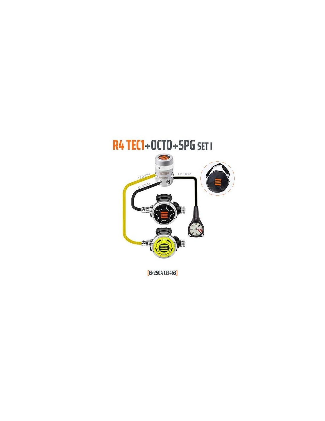 Set compuesto por 1ª etapa Tecline R4 de membrana compensada y cámara estanca, 2ª etapa TEC1 y Octopus TEC1 y manómetro.