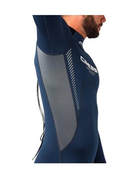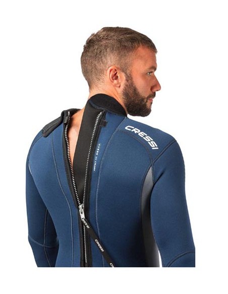 Finalmente, el cuello Anatomic Shape, con un diseño preformado de 120º de inclinación que aporta mayor confort, y los refuerzos antidesgaste Tatex® en rodillas y hombros, aumentan la protección del Fast 3mm en estas zonas críticas durante las inmersiones. Novedoso traje modular de primera gama y precio muy agresivo con nuevo patronage e interesantes soluciones técnicas que le aportan una remarcable estanqueidad. FAST combina un monopieza de 3 mm (disponible también en versiones 7 y 5 mm) con una capucha independiente de 5 mm y una chaqueta de 3,5 mm muy elástica. Los tres elementos pueden adquirirse por separado. Es un modular especialmente cómodo y fácil de colocar debido a sus nuevos manguitos de neopreno biforrado, simples, efectivos y muy resistentes con un anillo interior "Seal" para proporcionar estanqueidad. Esta solución aporta durabilidad y está garantizada y contrastada incluso por centros de buceo que lo utilizan como traje para escuela y alquiler con óptimos resultados. La cremallera dorsal YKK® tiene el sistema de estanqueidad Acquastop® con solapa interior de neopreno liso para minimizar las infiltraciones de agua. El cierre de la nuca presenta una notable mejora del diseño que reduce la entrada de agua en este punto crítico. La solapa de cierre es ahora mucho más amplia y la zona de la nuca está prolongada para evitar infiltraciones al inclinar el cuello bajo el agua. Cuello con diseño Anatomic Shape, con preformado a 120º para un máximo confort. Zona rodilla-tibia y hombreras con refuerzos elásticos antidesgaste en Tatex®. Este tipo de refuerzo prácticamente no limita la elasticidad del neopreno, proporciona un refuerzo suficiente y facilita la colocación del traje Forro en nylon especialmente elástico en ambas caras interior y exterior para optimizar la elasticidad del neopreno. Utiliza la misma calidad de neopreno que el resto de la colección de trajes Cressi a pesar de ser un traje de coste muy contenido.
